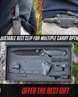 ✅GET YOUR HANDS ON A COMPLETE SURVIVAL KNIFE KIT: The Flint Rod with the G10 handle and the G10 Scraper included will help you start a fire in nature, while the Allen Wrench will hold all attachments on the K-Sheath.